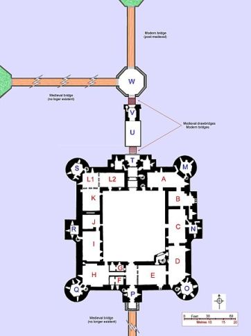 A. Household apartments, B. Chapel, C. Chamber, D. Great chamber, E. Lord's hall, F. Buttery, G. Pantry, H. Kitchen, I. Retainer's hall, J. Retainer's kitchen, K. Possible Ante room (on some plans K, L1 and L2 are shown as one room, on some two and others three), L1. Possible service rooms, L2. Possible stables, M. North-east tower, N. East tower, O. South-east tower, P. Postern tower, Q. South-west tower, R. West tower, S. North-west tower (and prison), T. Gatehouse (with guard rooms to left and right), U. Inner causeway, V. Outer Barbican, W. Outer causeway