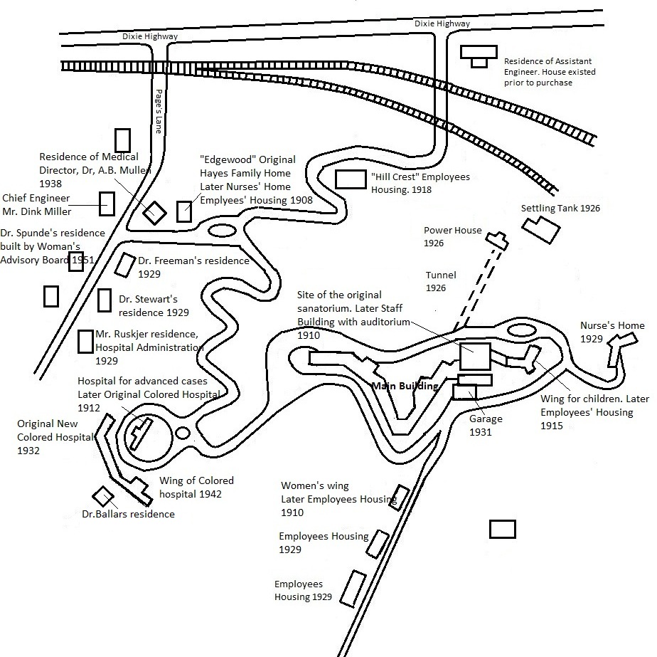 Внизу карта медицинского комплекса Вейверли Хиллз. Вверх этой карты- направлена на Запад. Большинство зданий к сожалению были снесены. Однако дороги и железная дорога до сих пор сохранились. Развалины зданий и домов сегодня утонули в буйном лесу который окружает бывший санаторий. Похоже никто не рылся и даже пытался ничего найти. Хотя зря. По- моему там много чего можно найти интересного.