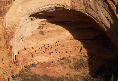 Betatakin occupies a 450-foot-wide alcove in Tsegi Canyon, housing about