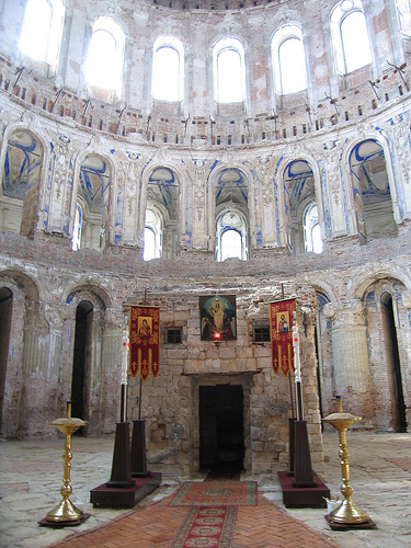 New Jerusalem Monastery or Voskresensky Monastery (Resurrection Monastery) is located 60 km (38 mi) West of Moscow in Russia. New Jerusalem Monastery was established in 1656 by Patriarch Nikon on the outskirts of Istria. While Christianity has a concept of a New Jerusalem as a heavenly paradise reserved for the righteous, Nikon has more practical use of its name. New Jerusalem Monastery was designed to mimic the greatest Christian shrine, Church of Holy Sepulcher in Jerusalem, Israel. Furthermore surrounding hills and rivers were given Jewish names to further support similarities between the sites. Local springs is said to have miraculous healing abilities. Traveling was hard and dangerous at these turbulent times. So this monastery was a second best option to visit actual Jerusalem and its surroundings. Many of the features in the New Jerusalem Monastery indicate that at least some similarity was achieved in the appearance and a layout of the buildings as they are constructed in Jerusalem.